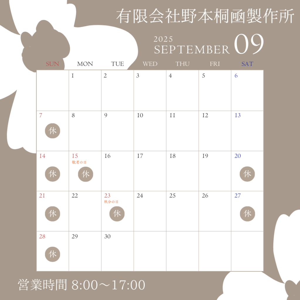 9月の営業日 投稿日: 2025年9月2日2025年9月2日 投稿者: 野本桐凾製作所 こんにちは!野本桐凾製作所です(^^)/ まだまだ残暑厳しいですが、皆様いかがお過ごしでしょうか(・・? 工場内は暑くてまだまだ熱中症対策をしていかなければならないほどです(;´・ω・) さてさて9月の営業日です(^▽^)/ 今月の土曜日は第3・4土曜日が休業日となっております。変更になる場合もございますので、御用の方はお電話での確認をお願いいたします。