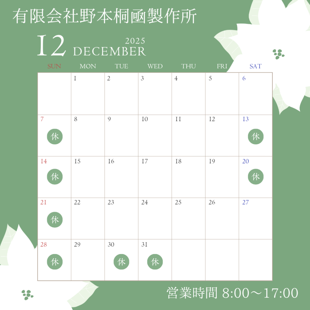 12月の営業日 投稿日: 2025年12月12日2025年12月12日 投稿者: 野本桐凾製作所 こんにちは!野本桐凾製作所です(^▽^)/ 気が付けば12月も1/3を過ぎていました(;´・ω・) 今更ながら営業日のお知らせです(*^^)v 今月の土曜日は第二・三が休業日となっております(*’ω’*) 年末年始に関しましては後日改めてお知らせしたいと思います。