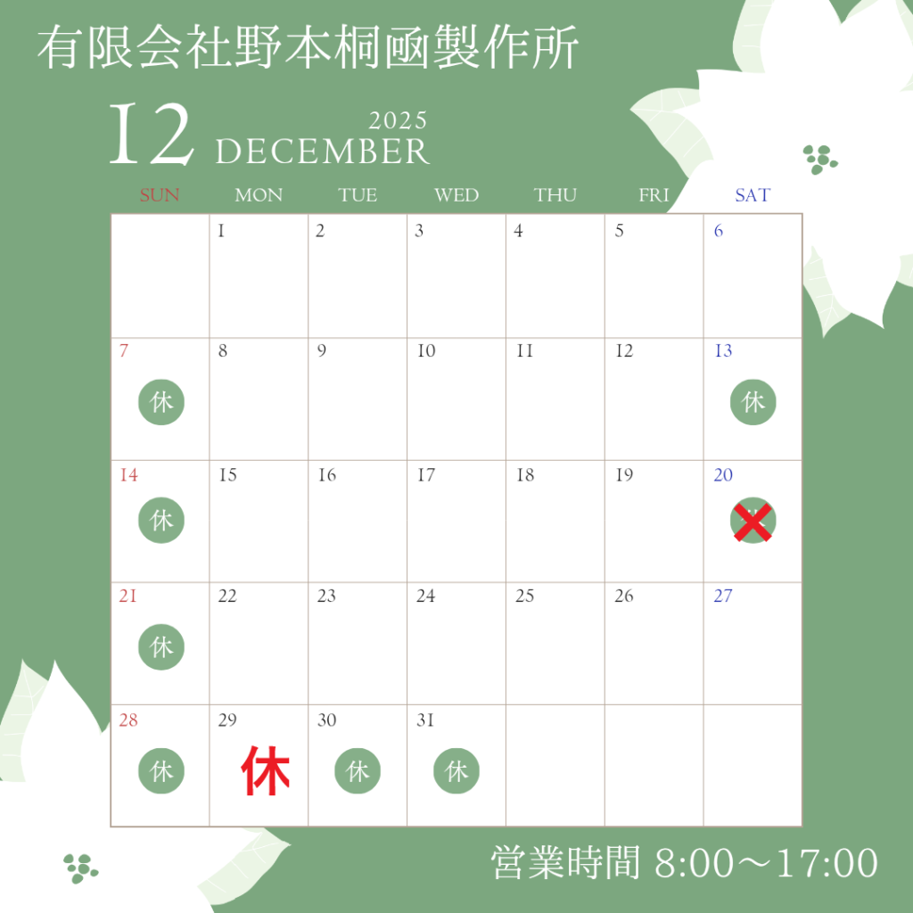 12月営業日&年末年始の休業日 投稿日: 2025年12月23日2025年12月23日 投稿者: 野本桐凾製作所 こんにちは!野本桐凾製作所です(^^)/ 約1週間で今年も終わってしまいますね(;´・ω・)あっという間の1年だった気がします(⌒∇⌒) 前回、12月の営業カレンダーを載せましたが変更となっております。 もう過ぎっちゃってますね(;´・ω・)29日が休業日となりましたので、お間違えの無いようお願いします。 そして、年末年始の休業日のご案内です。 12/28~1/4まで休業とさせていただきます。1/5より通常営業となりますので、よろしくお願いいたします。